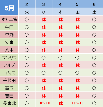 ・上記3店舗以外 …… 5/1(水)~5/3(金)はお休みさせていただきます。