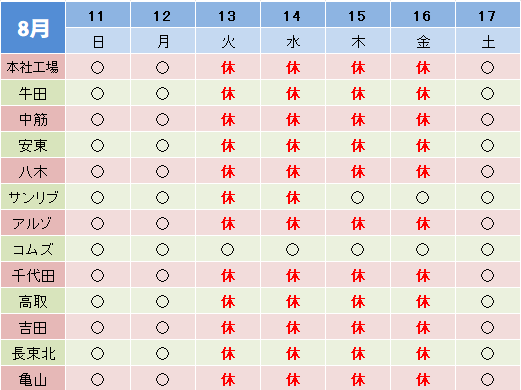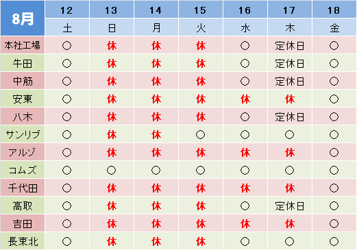 8月のお盆期間中は、各店舗の営業が以下の通り変更となります。