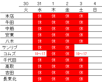 | 牛田本町店 | 営業中 | 休 | 休 | 休 | 休 | 休 | 営業中 |
