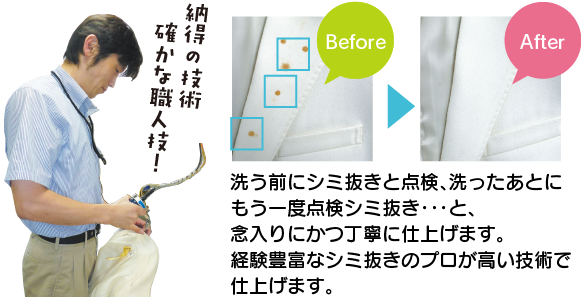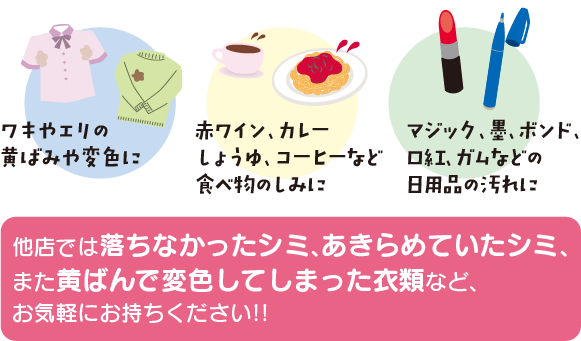 あきらめないで、当店のとことんシミ抜きコースをご利用下さい。 当店自慢の特殊シミ抜き技術は、付いて時間が経過し落ちにくくなったシミや元々落ちにくいシミを徹底的に落とす技術です。