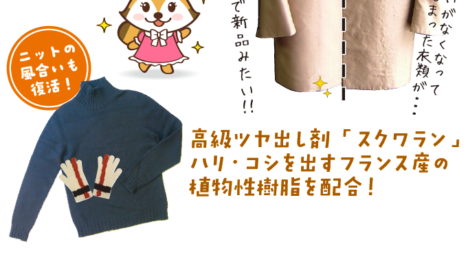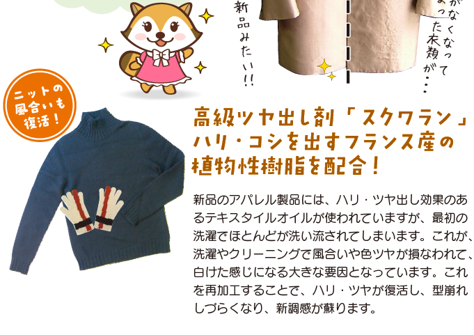新品のアパレル製品には、ハリ・ツヤ出し効果のあるテキスタイルオイルが使われていますが、最初の洗濯でほとんどが洗い流されてしまいます。これが、洗濯やクリーニングで風合いや色ツヤが損なわれて、白けた感じになる大きな要因となっています。これを再加工することで、ハリ・ツヤが復活し、型崩れしづらくなり、新調感が蘇ります。